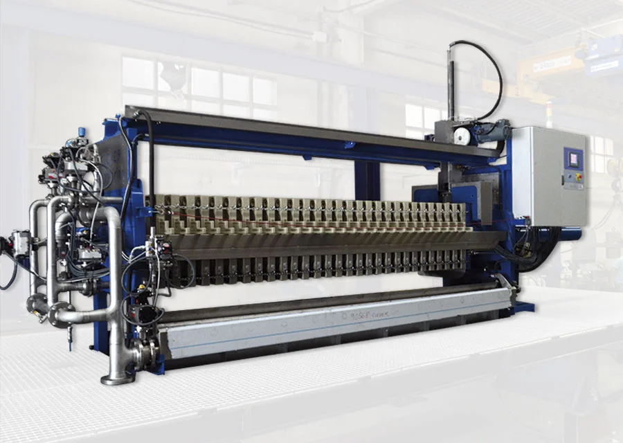 Filtro prensa automático para altos caudales con descarga automática y mínima intervención manual.