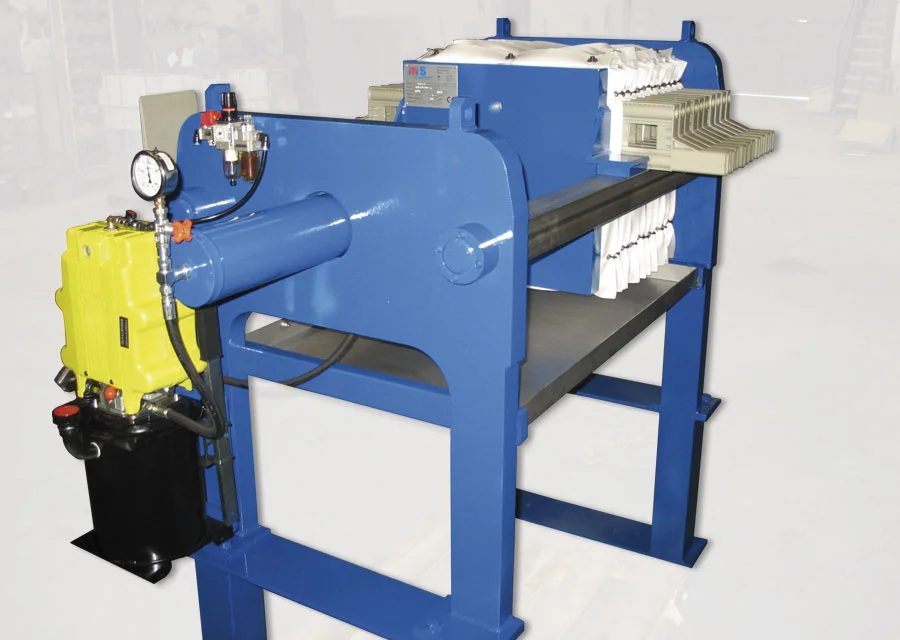 Filtro prensa semiautomático con grupo hidráulico motorizado y descarga de placas eficiente con mínima intervención.